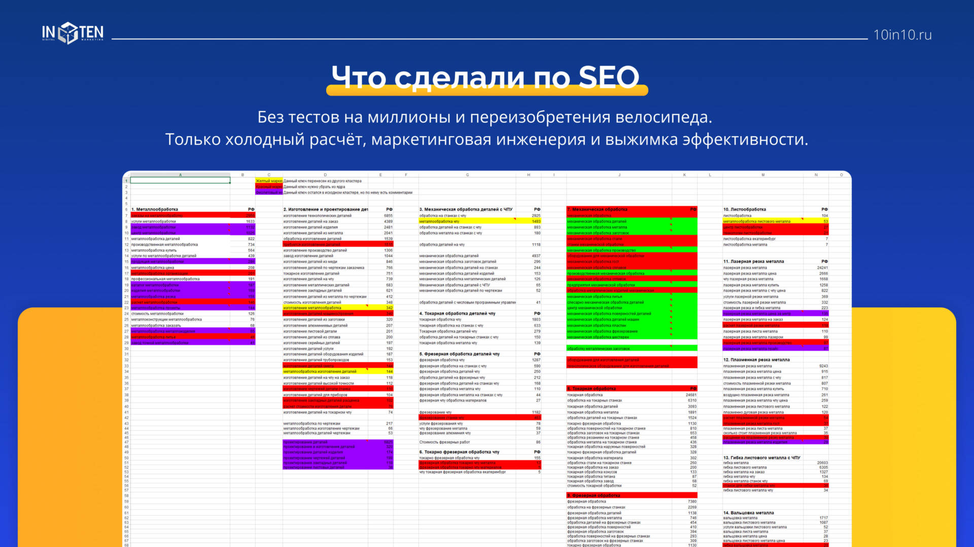 Вот отдел поискового продвижения. Кстати, заглянем сюда, раз уж зашла речь. Пока видеографы и фотографы работают на объекте клиента, сеошники уже вовсю собирают и распределяют по посадочным страницам семантику (поисковые запросы, по которым в дальнейшем будет продвигаться сайт).