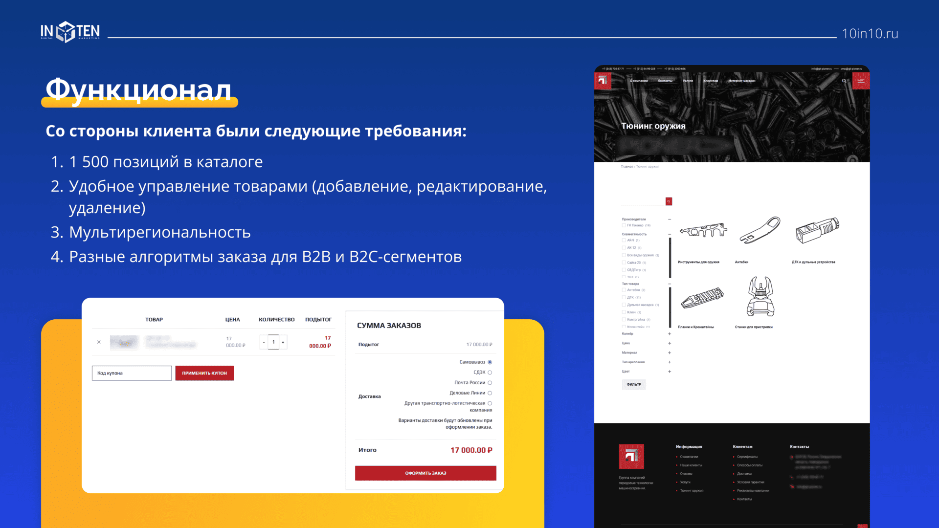 Наконец, стояла задача по проработке разных алгоритмов заказа для B2B- и B2C-посетителей. Тут сложность в том, что “физики” и “юрики” сильно отличаются на этапе оформления заказа. Первым достаточно указать контактный телефон и дождаться звонка менеджера. Вторым же нужен полноценный счет на оплату: там нужно заполнять 100500 полей, указывать ИНН, КПП, и т.д., и т.п. В общем, мы сделали упрощенную форму обратной связи для частных лиц и полноценную анкету – для компаний. В результате и те, и другие получили возможность быстро заказать необходимую продукцию без заполнения лишней информации.