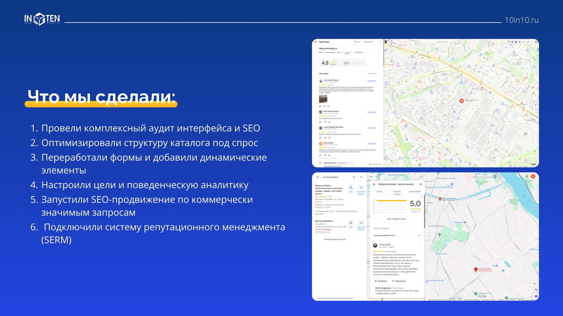 В ходе работы мы подробно проанализировали ситуацию клиента по 151 показателю. Данные передали в различные отделы компании Интен Диджитал для детальной проработки каждого блока. На выходе получился документ с 250 страницами практических рекомендаций и конкретных пошаговых действий. Они позволили оптимизировать маркетинг “МеталлПромМебели” и вывести предприятие на дополнительную прибыль.