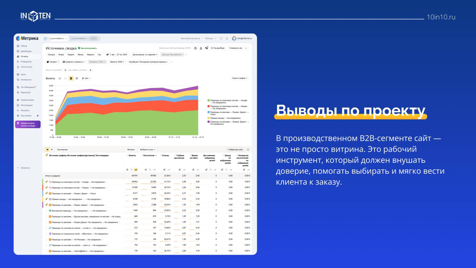 На основании уже имеющихся результатов мы провели комплексный аудит сайта “МеталлПромМебель” и дали ключевые рекомендации по его доработке. Постараемся больше не грузить вас терминологией: за множеством задач со сложными названиями, которые мы выполнили, на самом деле стоял простой и понятный вывод. Суть его такова: сейчас клиент работает практически вслепую; есть какие-то каналы привлечения трафика (соцсети, SEO, контекстная реклама), но как они работают и насколько эффективны – непонятно. Изучив все задействованные способы продвижения и их отдачу, можно существенно снизить затраты и увеличить прибыль.