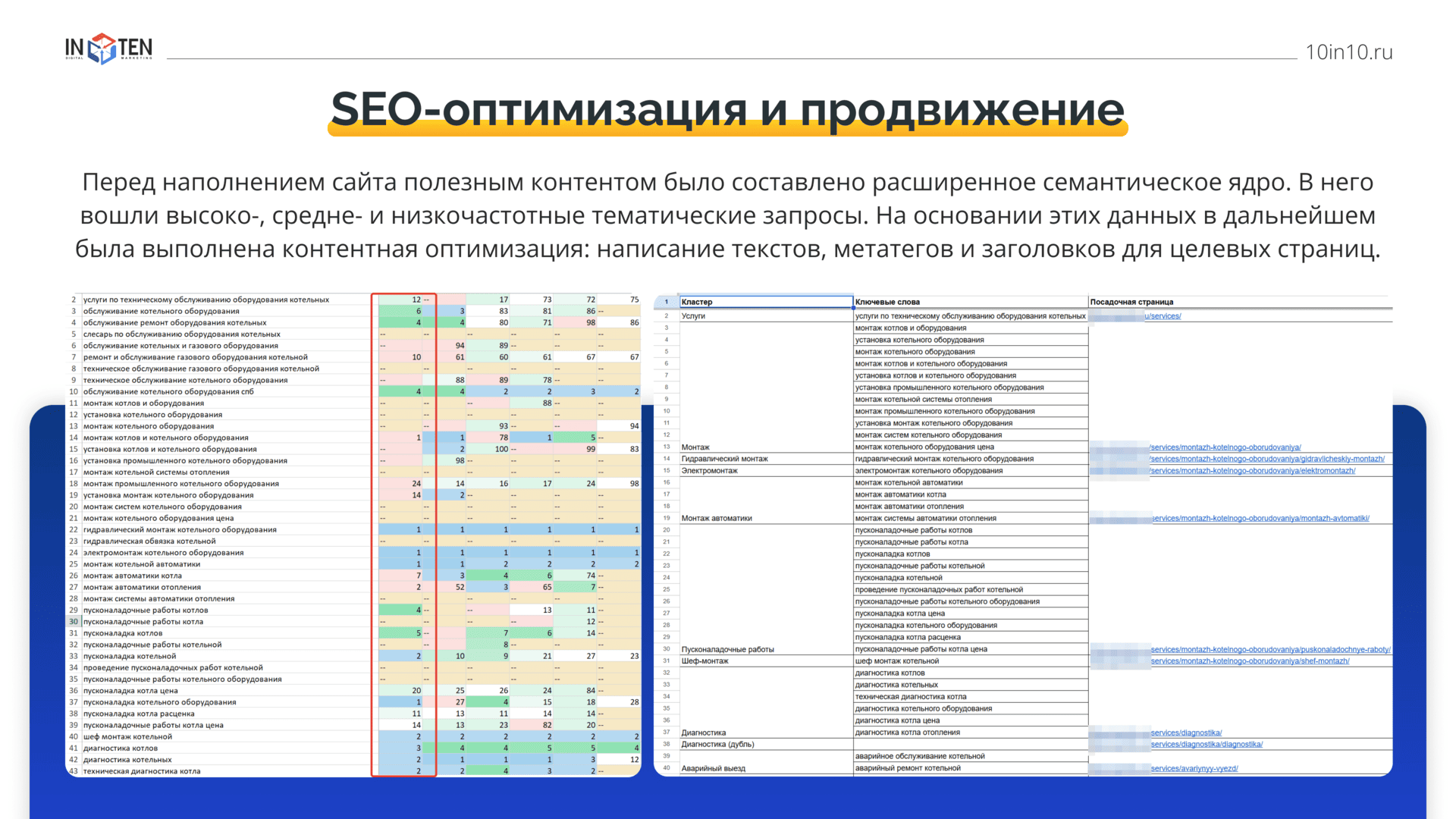 Перед наполнением сайта полезным контентом было составлено расширенное семантическое ядро. В него вошли высоко-, средне- и низкочастотные тематические запросы. На основании этих данных в дальнейшем была выполнена контентная оптимизация: написание текстов, метатегов и заголовков для целевых страниц.