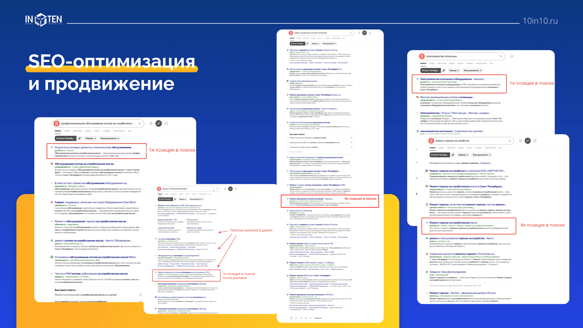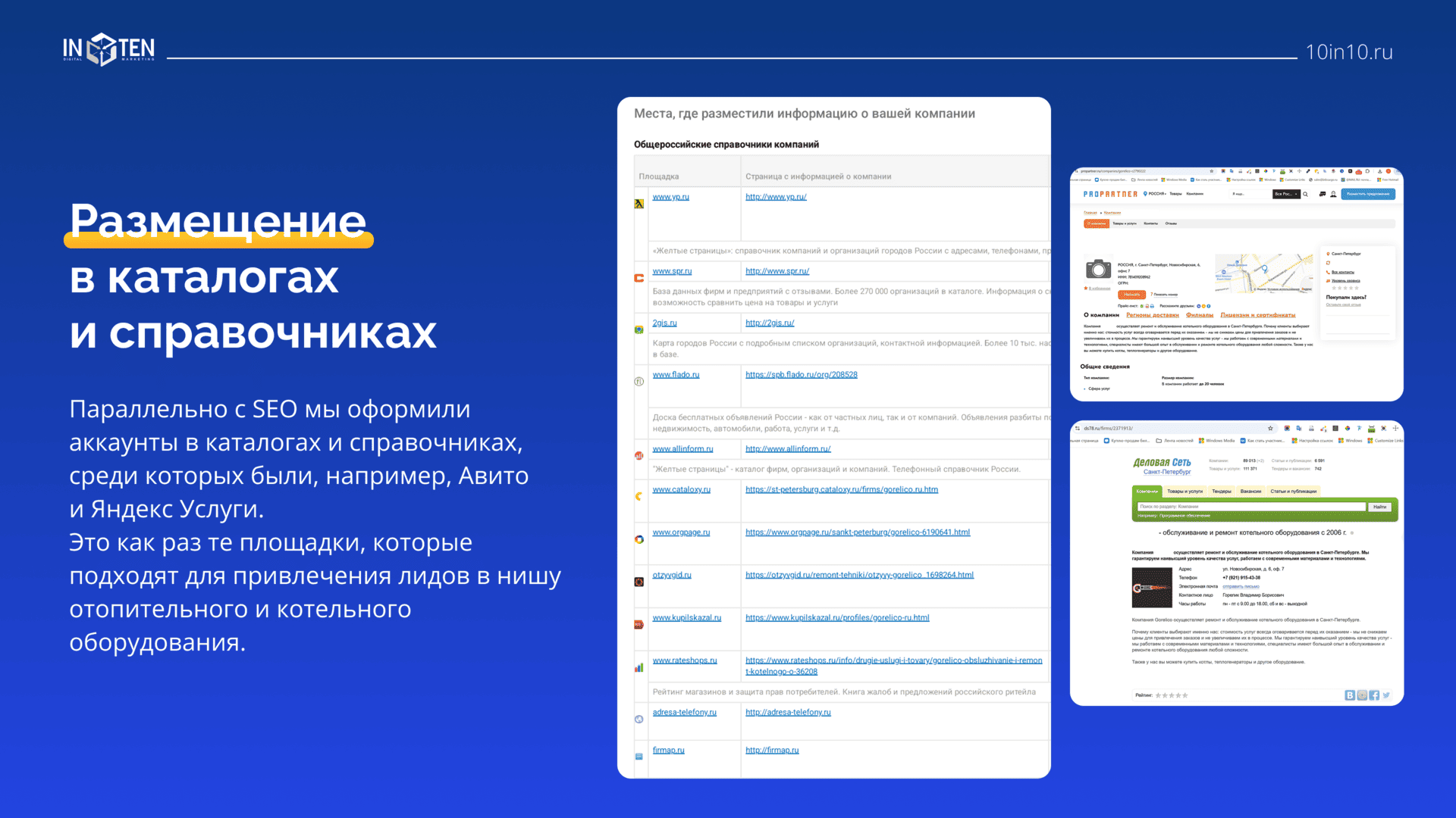 Параллельно с SEO мы оформили аккаунты в каталогах и справочниках, среди которых были, например, Авито и Яндекс Услуги. Это как раз те площадки, которые подходят для привлечения лидов в нишу отопительного и котельного оборудования. Кроме того, создали аккаунт в Яндекс Бизнесе и обеспечили появление компании на Яндекс Картах. А еще зарегистрировали ее во всех ключевых отзовиках для управления отзывами и репутацией, потому что это первое, к чему обращаются потенциальные клиенты, находясь на третьей ступени лестницы Ханта (изучение предложений и сравнение с конкурентами), выбирая кто из исполнителей сможет решить их потребность.
