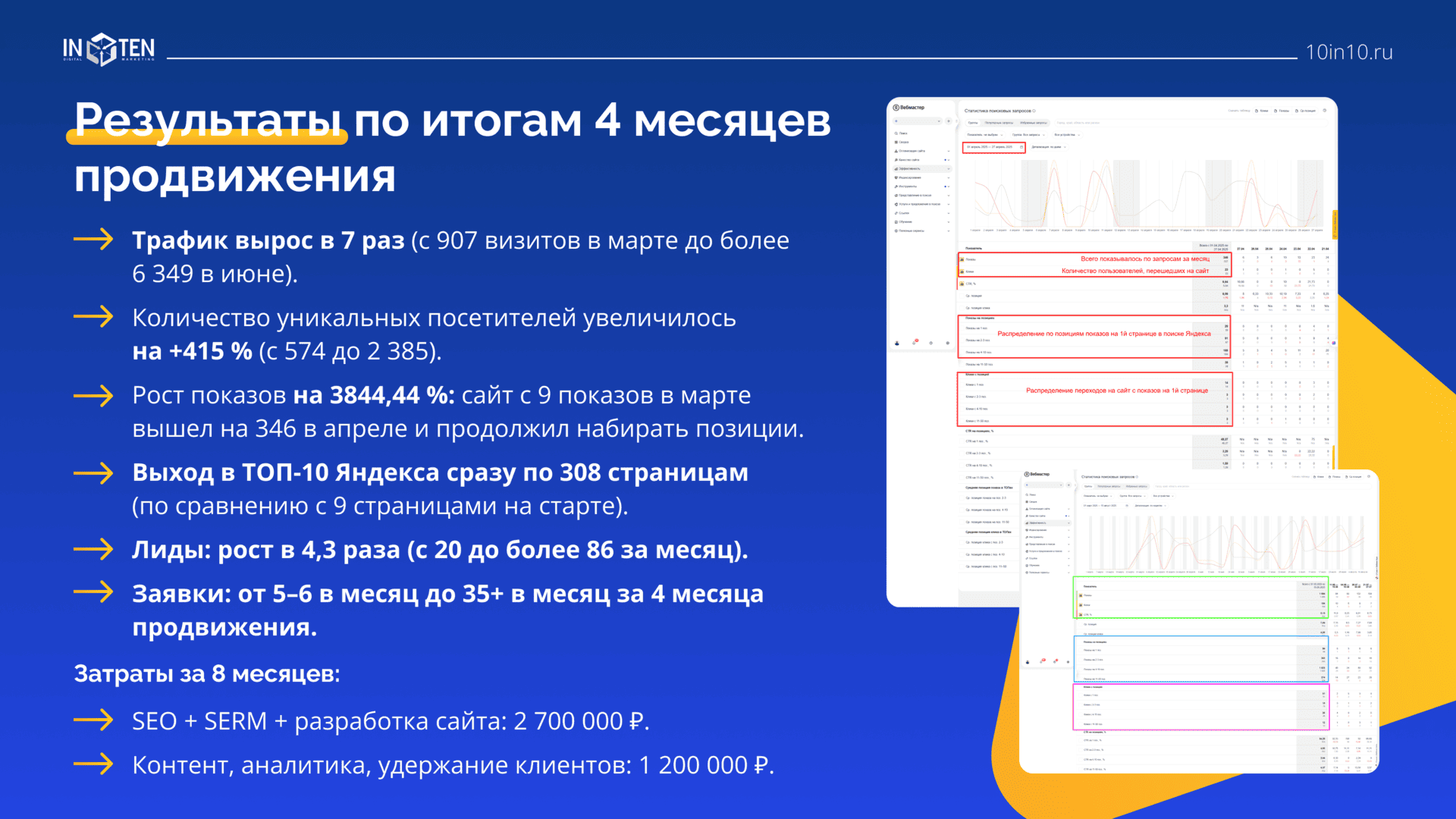 Когда маркетинг работает как единая система, даже «спящие» сайты начинают приносить поток заявок. Вместо нулевых переходов и разрозненных кликов мы получили стабильный рост SEO-позиций, качественный трафик и конверсию в лиды.
